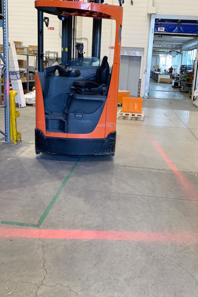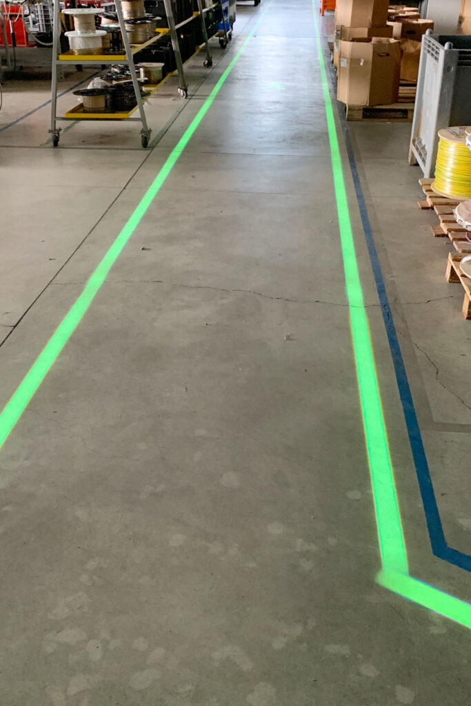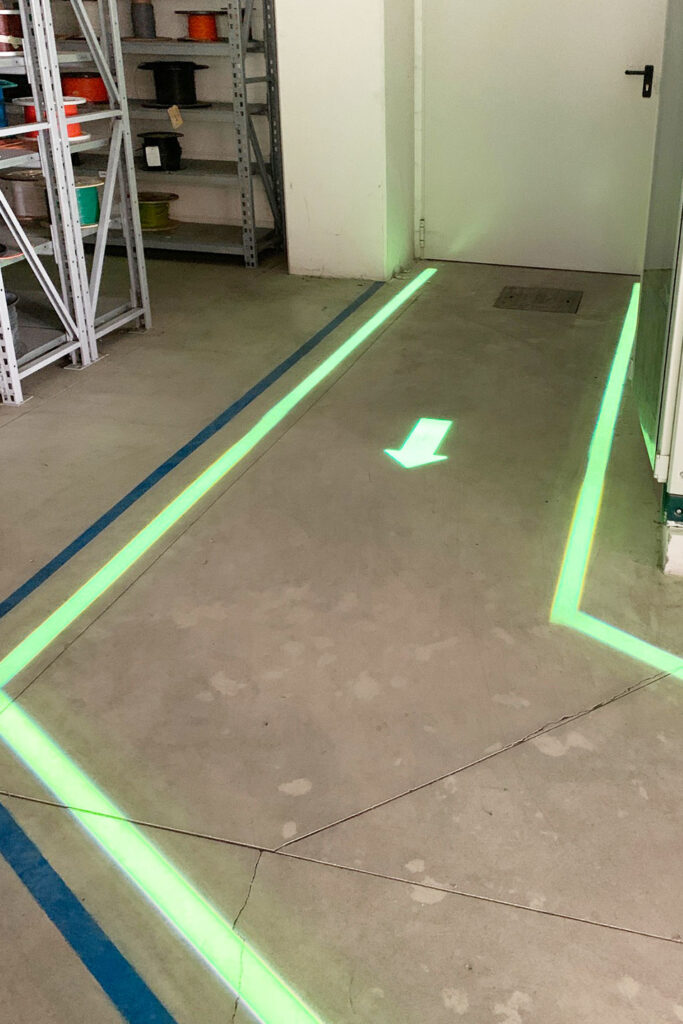 Queste lampade, attraverso la proiezione su pavimento di linee o pittogrammi a basso consumo energetico, permettono di evitare l’utilizzo di vernici tossiche su pavimento, la continua riverniciatura e il conseguente smaltimento dei materiali laddove necessario.